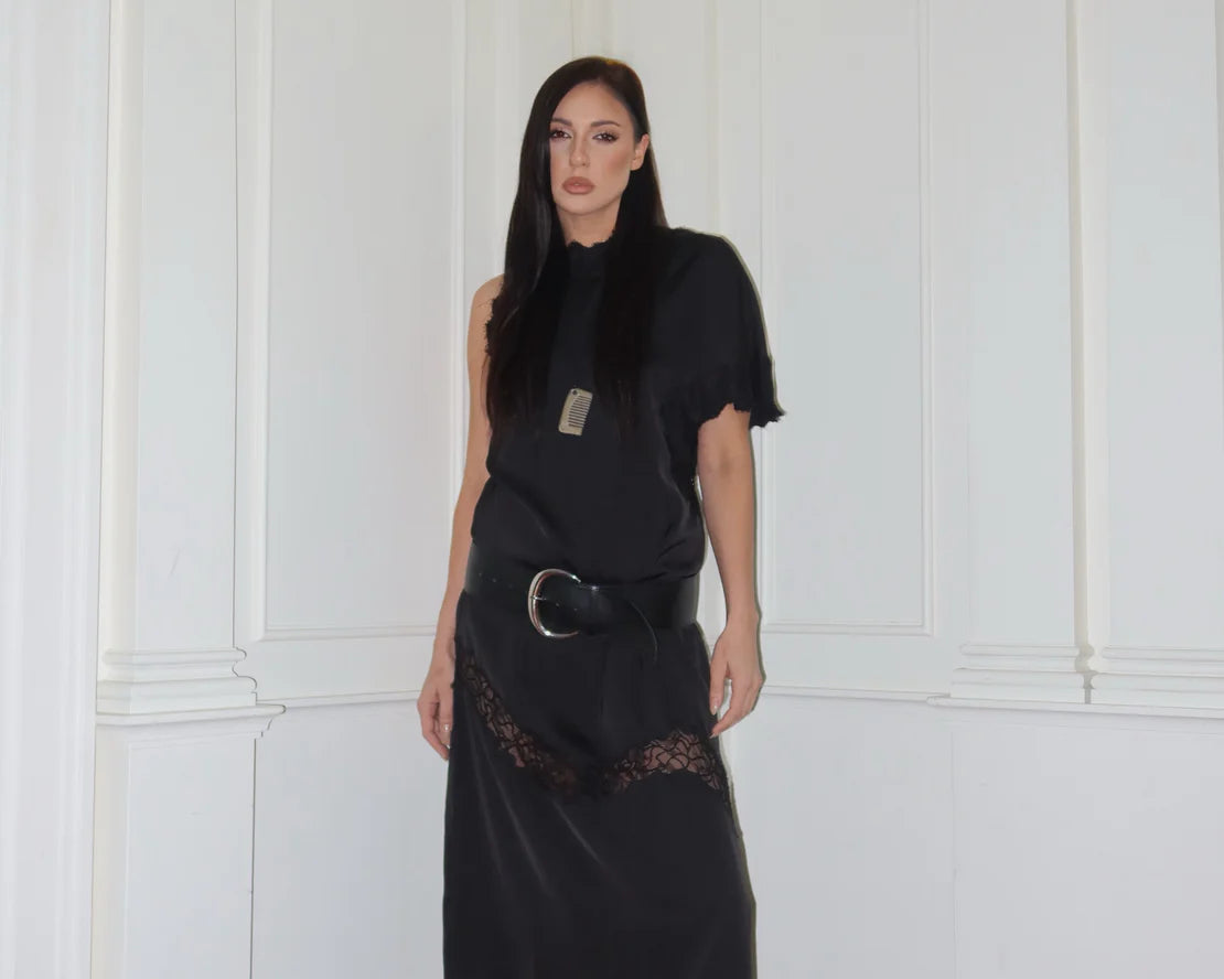An elevated after-dark look pairing statement lace, deep burgundy accents, and molten-gold details for effortless evening glamour.