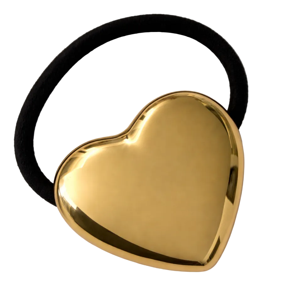 A functional essential reimagined with a sculptural touch. This gold heart hair elastic features a softly contoured, high-polish heart designed to sit effortlessly against the hair, catching the light without overpowering the look.