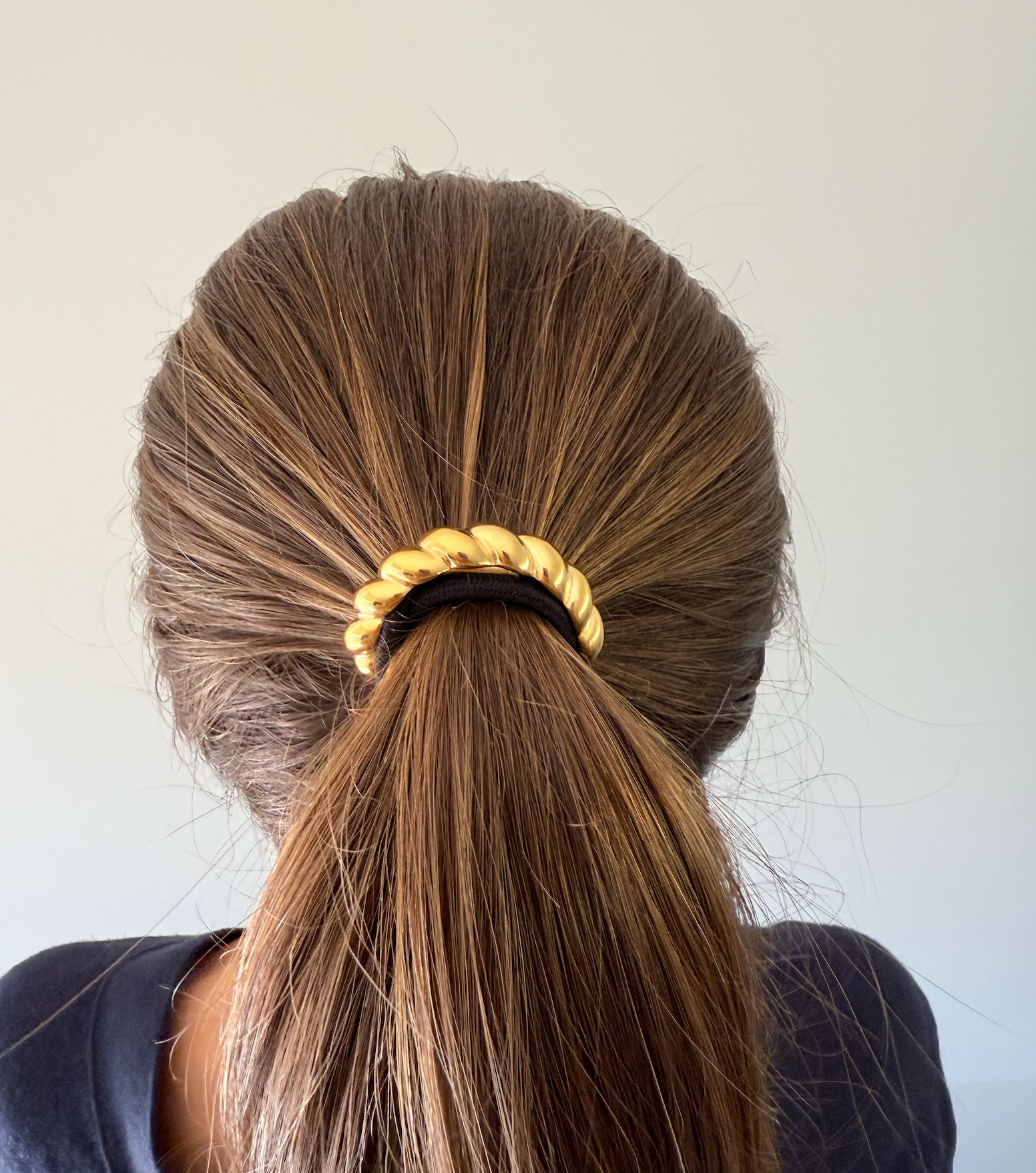 This piece reimagines the everyday hair tie as something intentional. A polished gold twisted form is set against a simple black elastic, creating contrast through material and restraint rather than excess. The result is subtle, functional, and quietly refined.