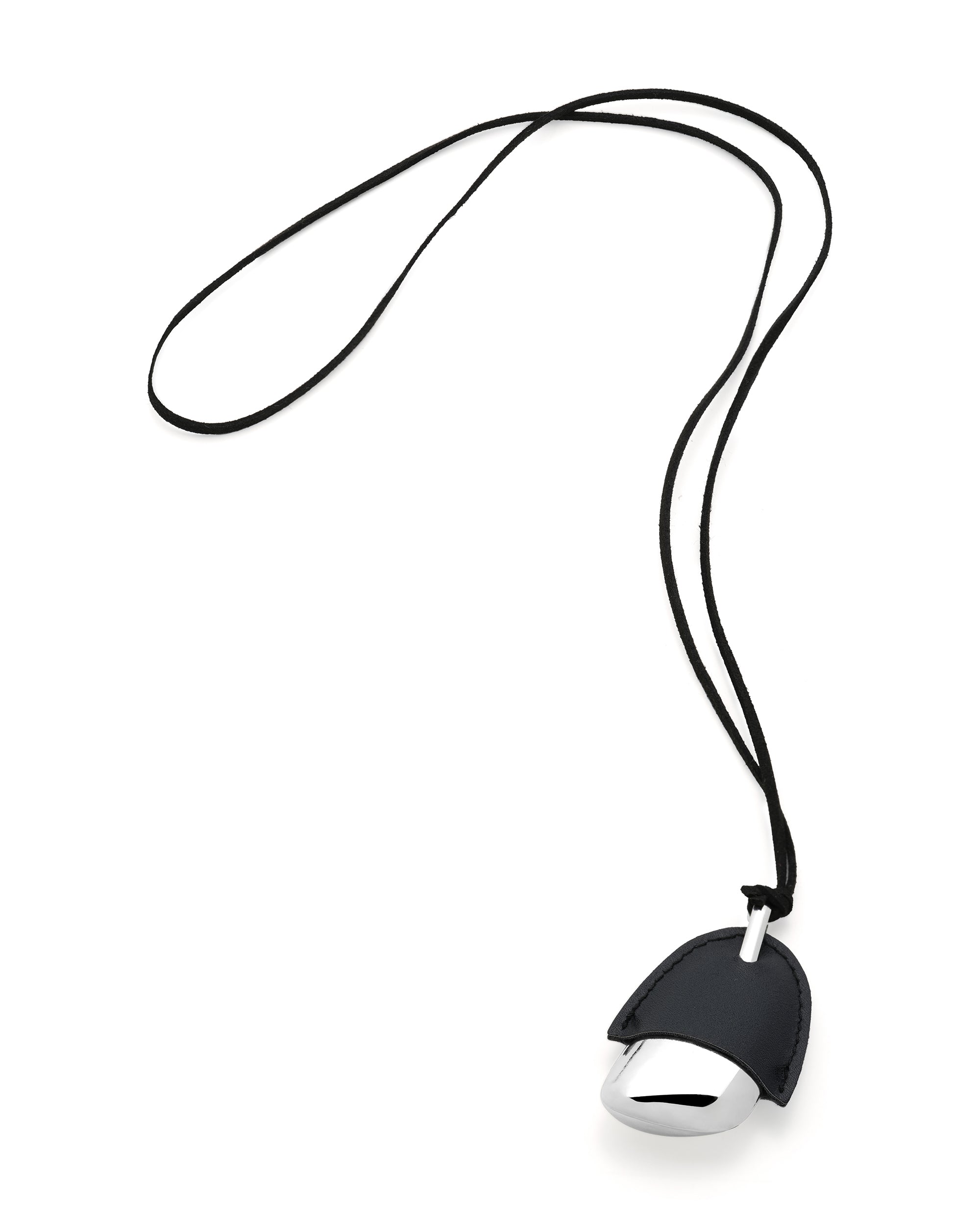 A study in contrast and restraint. This pendant features a smooth, polished silver-tone pebble set into a matte black leather cap, suspended from a fine leather cord. Sculptural yet understated, it’s designed to sit effortlessly against the body.