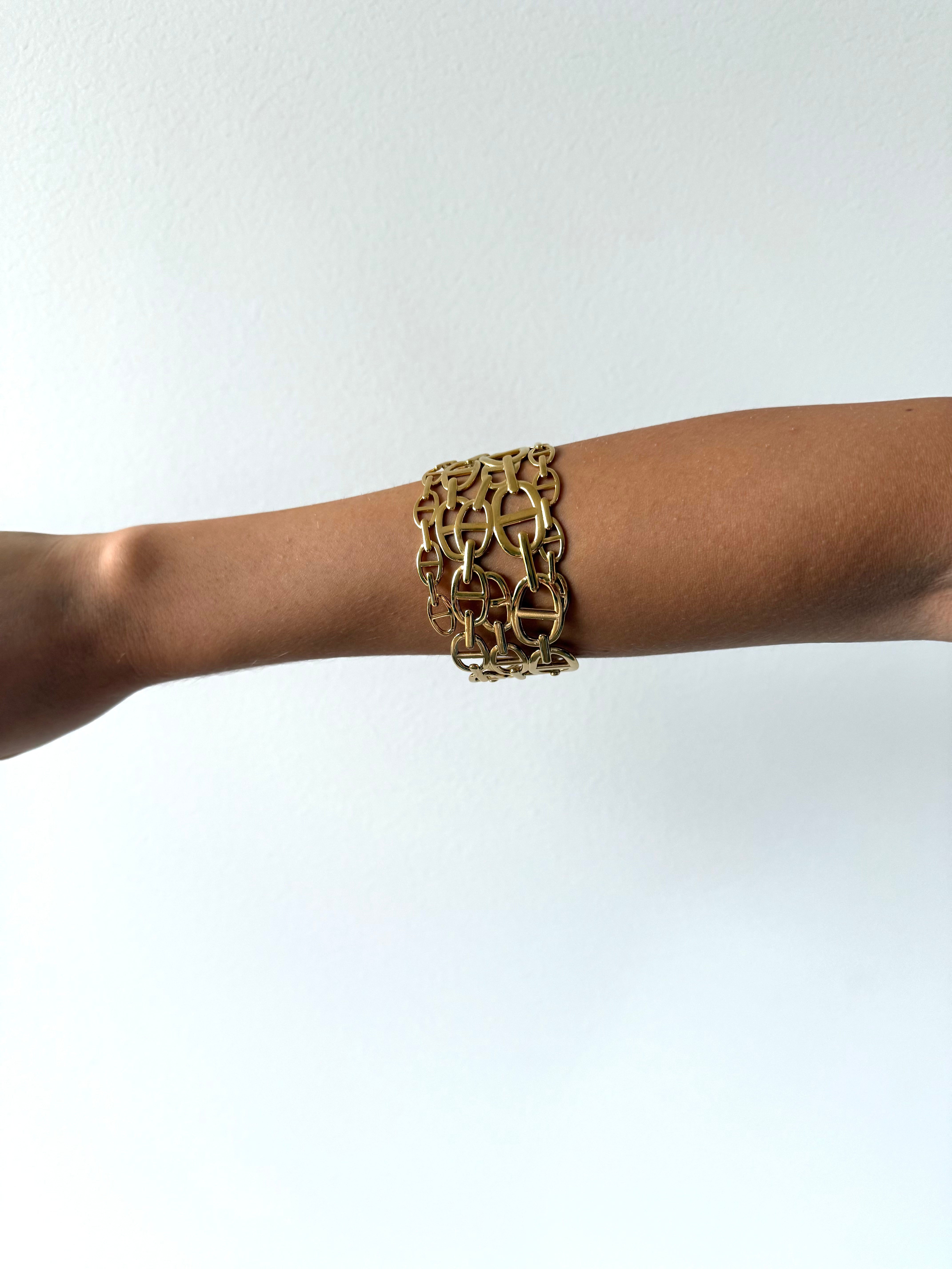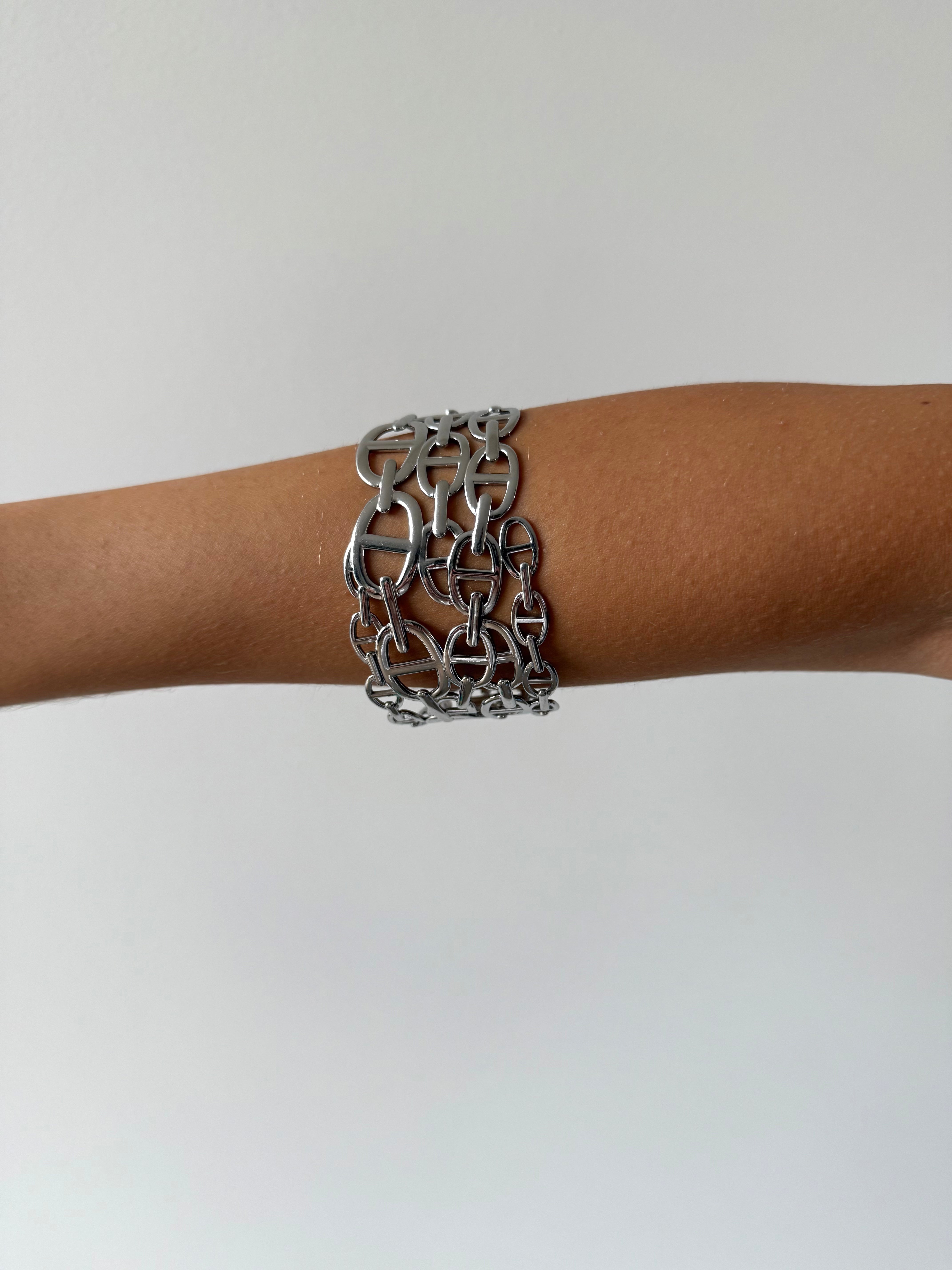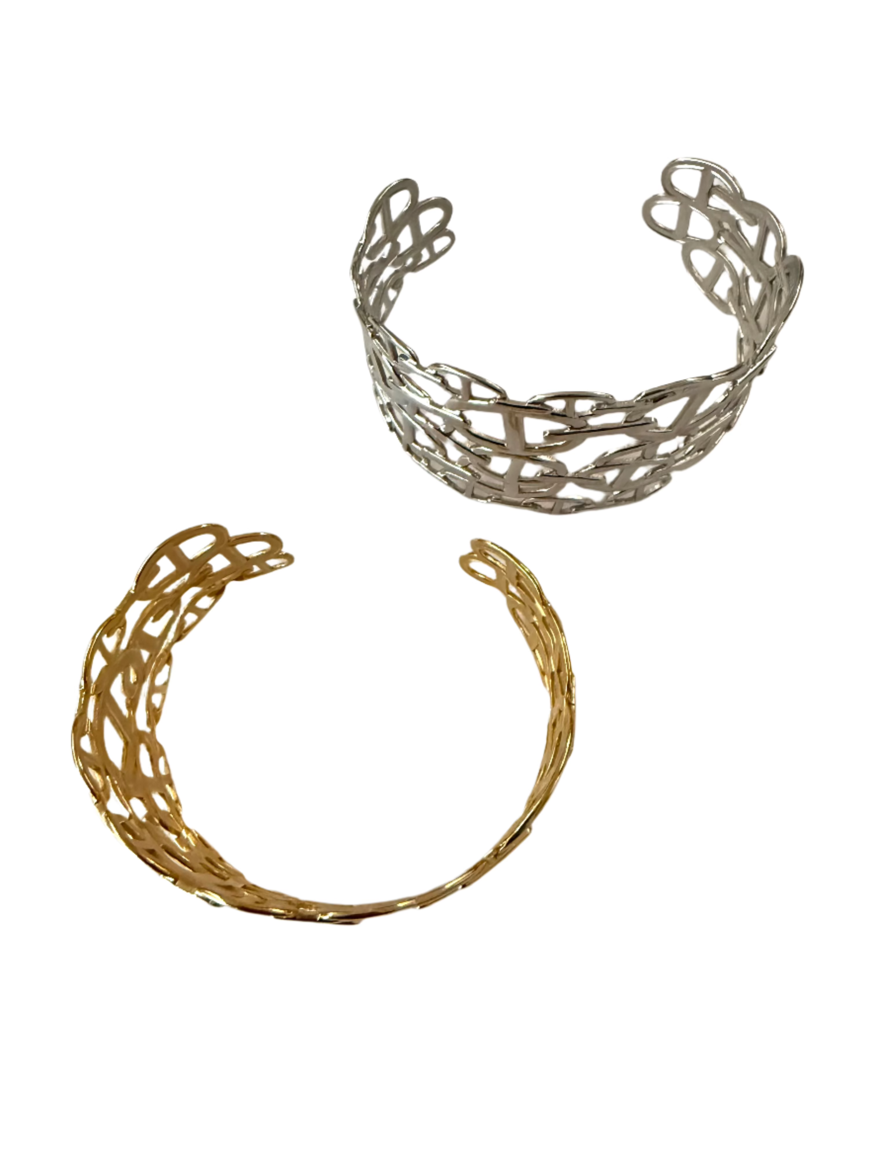 Built from oversized interlocking links, this open cuff bracelet explores scale and structure through a sculptural, chain-like form. The open silhouette allows the links to sit fluidly around the wrist, creating a sense of movement despite the piece’s light weight and presence.