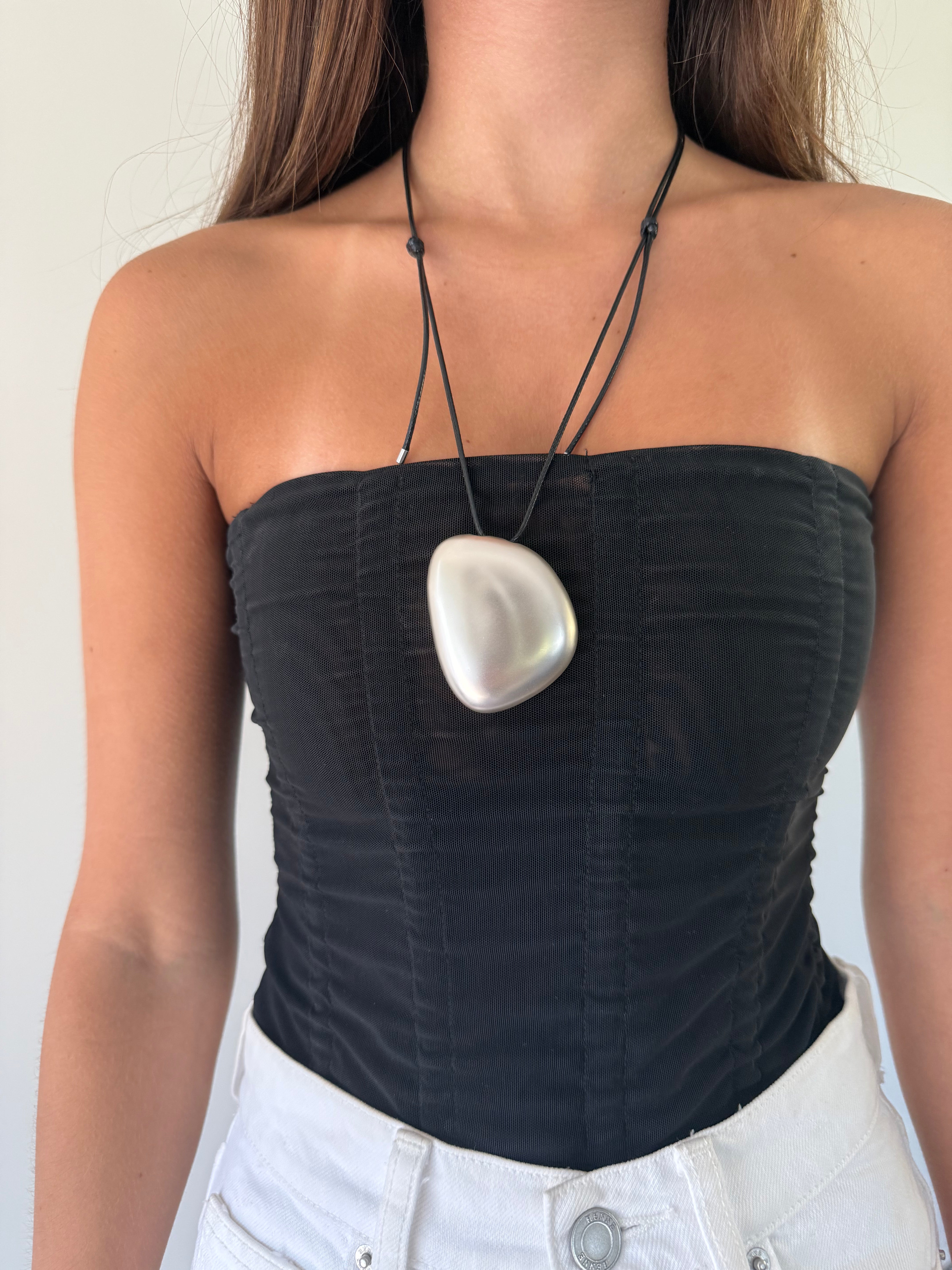 A study in restraint. These pendant necklaces are defined by clean lines, softened edges, and quiet contrast. Each smooth, polished form is paired with a silk cord—black for silver, chocolate brown for gold—chosen to ground the piece and let the metal speak.