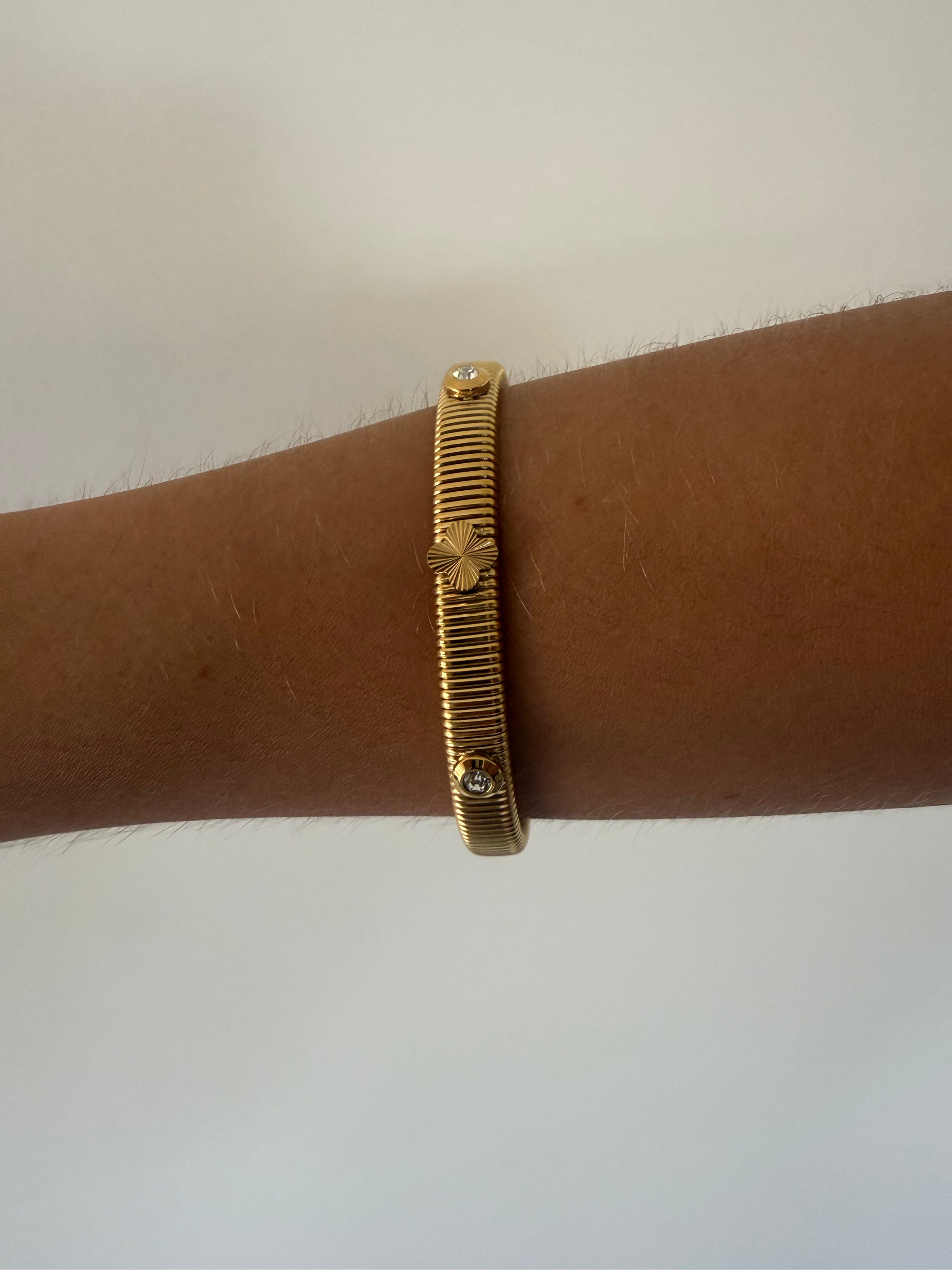 Finished in a high-polish gold tone, the design is punctuated with subtle crystal detailing and a small clover motif, adding contrast without distraction. The flexible cuff construction allows the bracelet to sit comfortably on the wrist, holding its shape while remaining effortless to wear.