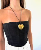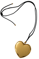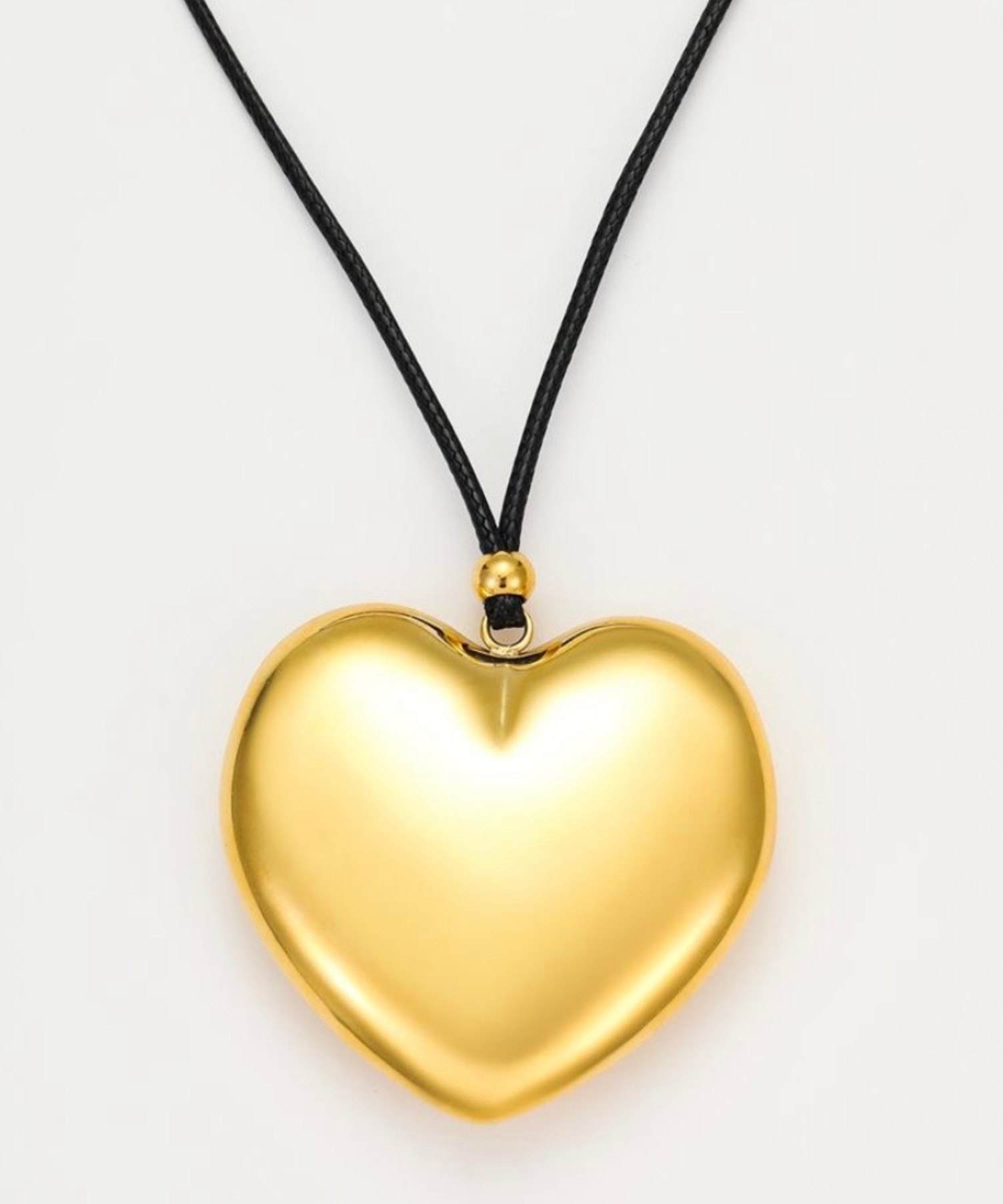 A softened heart form, reduced to its essential shape. This polished gold pendant is suspended from a fine black cord, creating a clean contrast that allows the form to stand alone.
