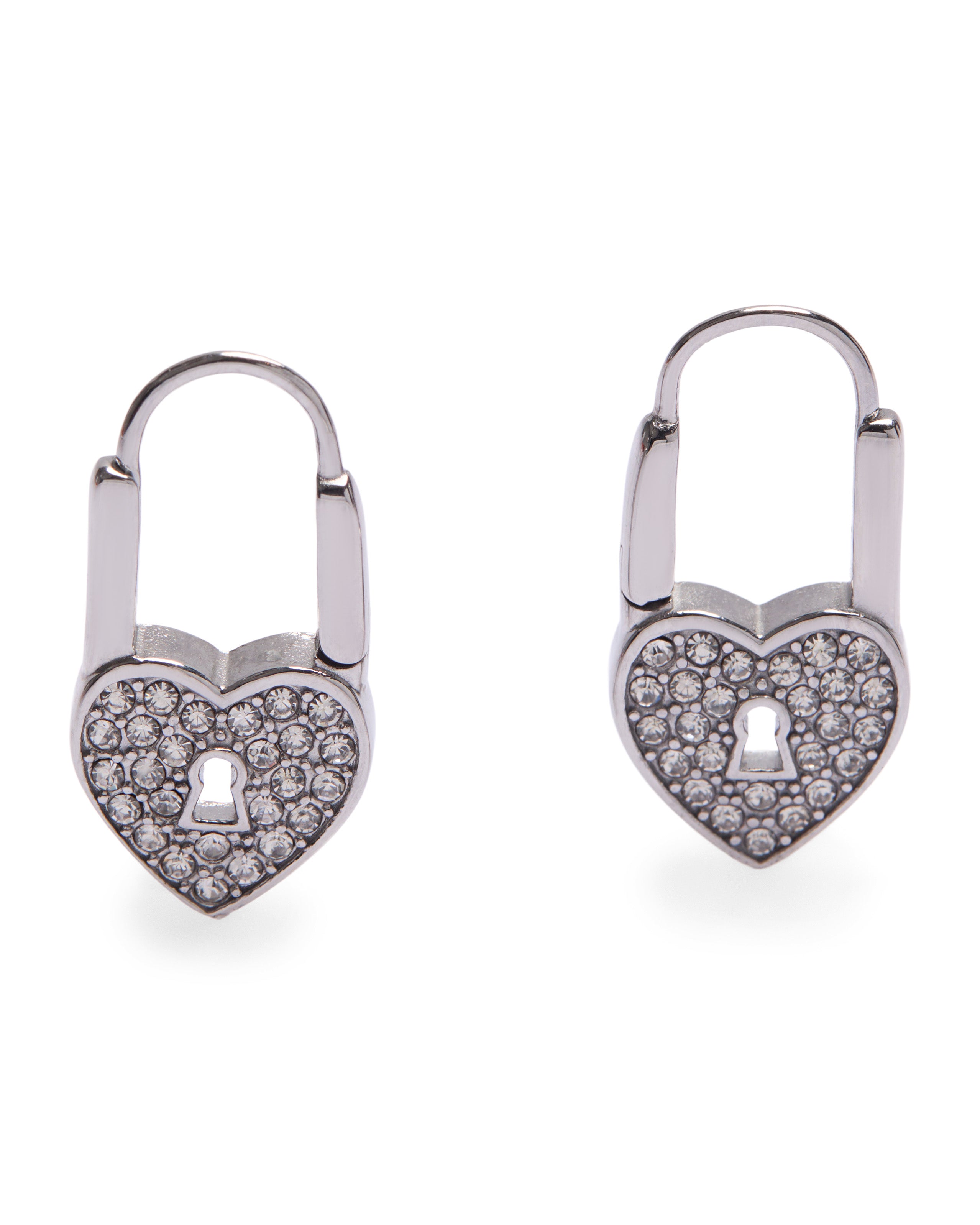 Shaped as a heart-form padlock, these earrings combine sculptural structure with delicate pavé detailing. The polished metal frame contrasts with fine crystal texture, creating subtle light and depth without feeling excessive.