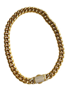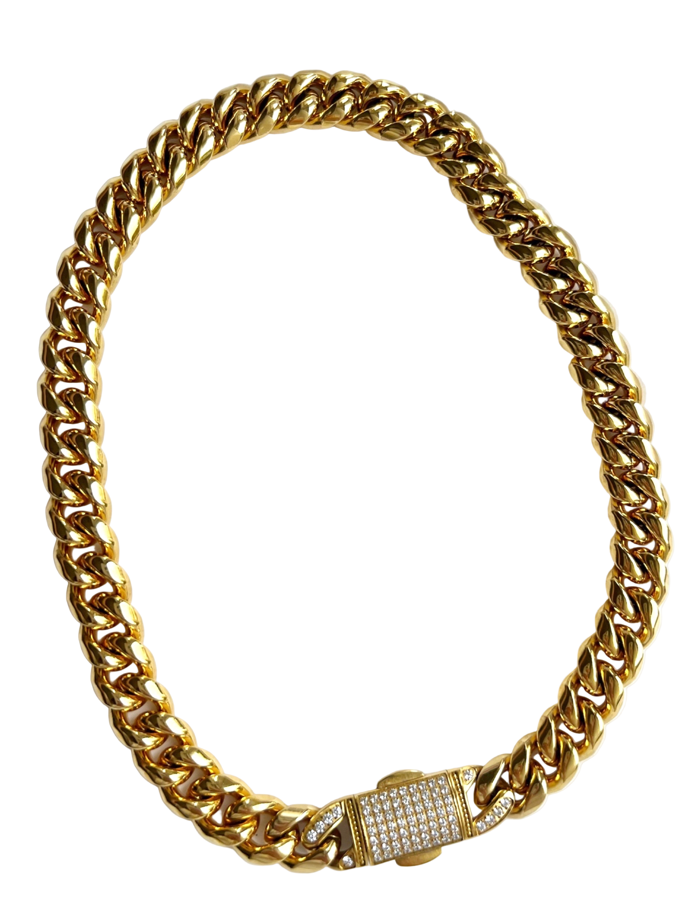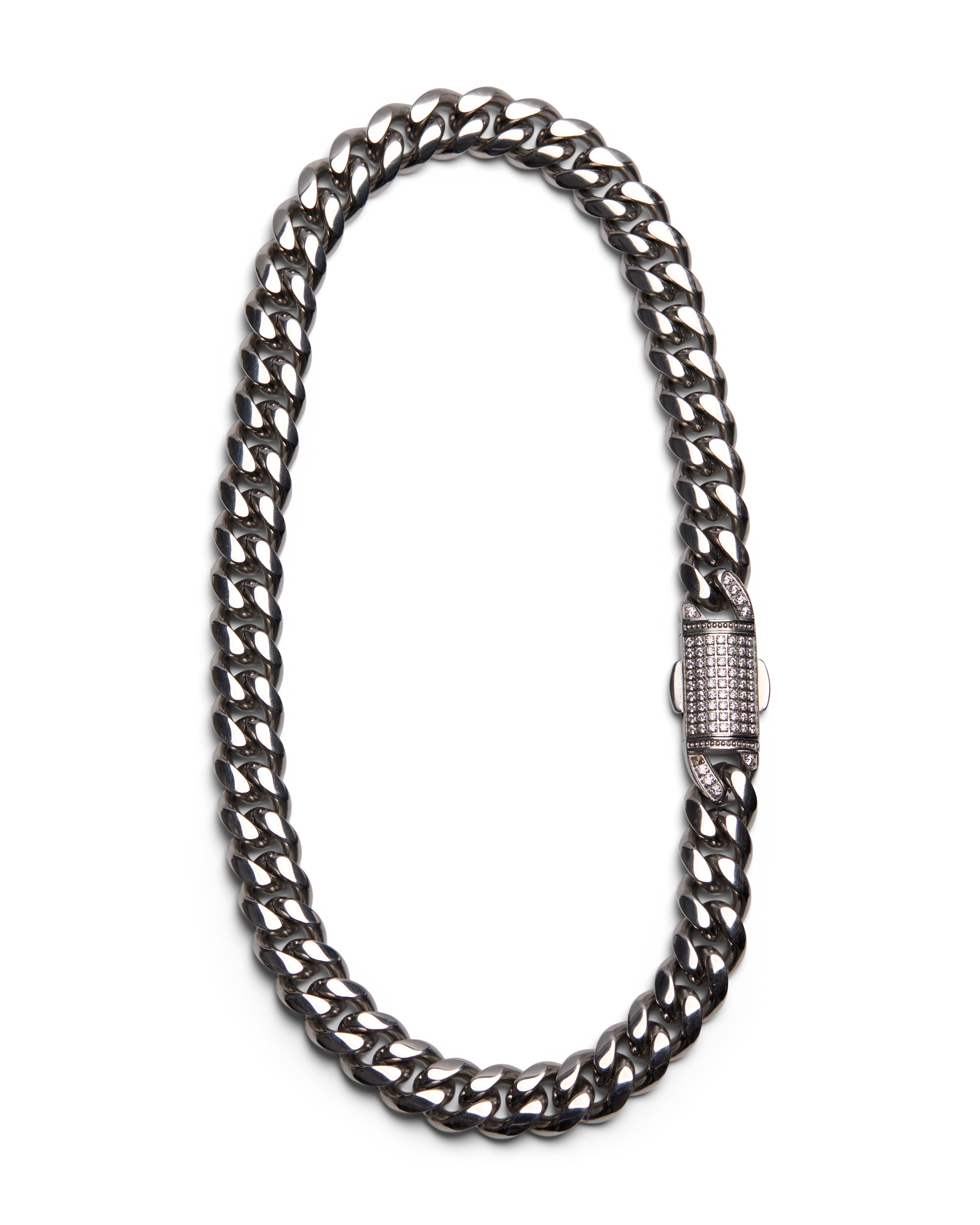 This necklace is built around contrast — weight and refinement, structure and shine. A classic chunky chain is paired with a pavé-set clasp, turning a traditionally functional detail into the focal point. The result feels deliberate and quietly bold.