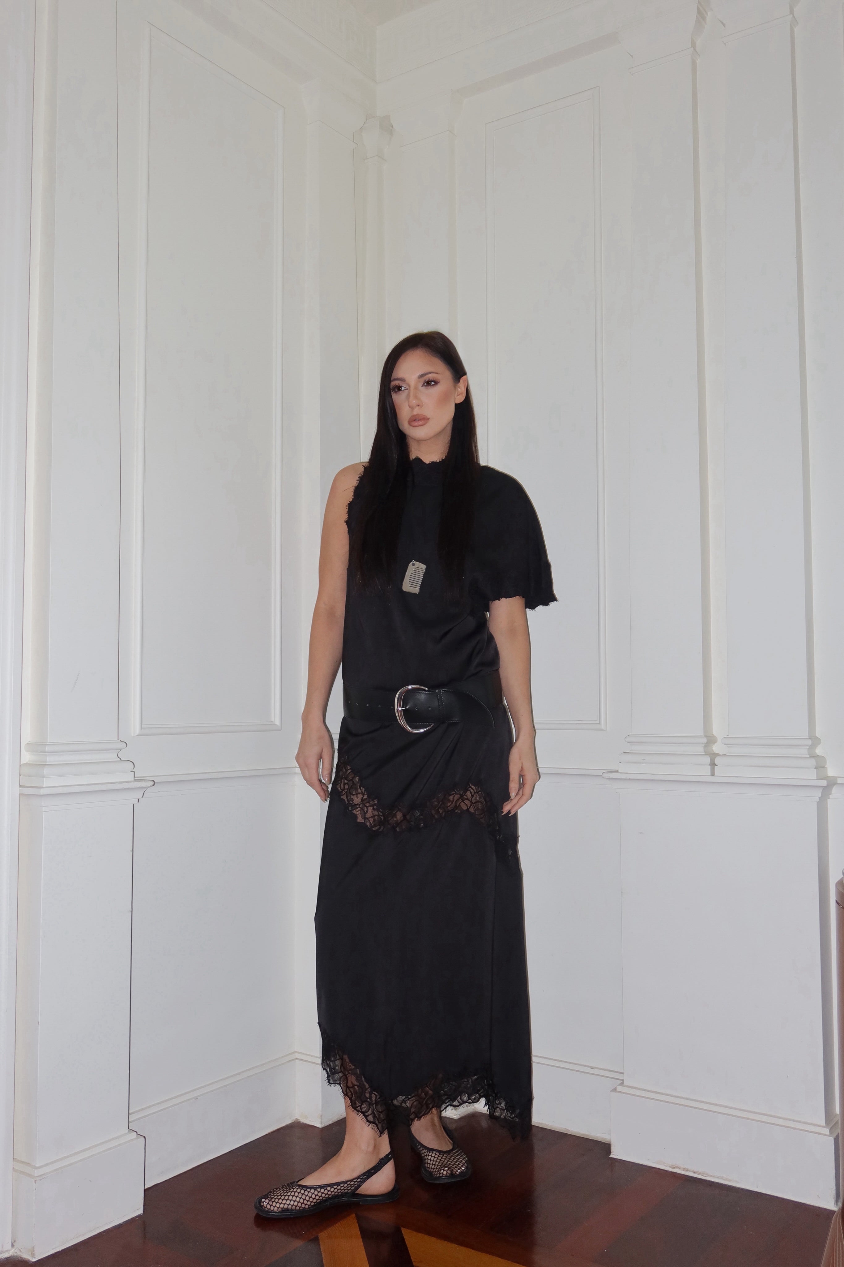 Available in polished gold or silver, each pendant offers a distinct mood: gold brings warmth and a subtle vintage sensibility, while silver feels cooler, sharper, and more contemporary. Suspended from an adjustable black cord, the contrast between metal and soft textile gives the piece its edge—refined but unfussy.