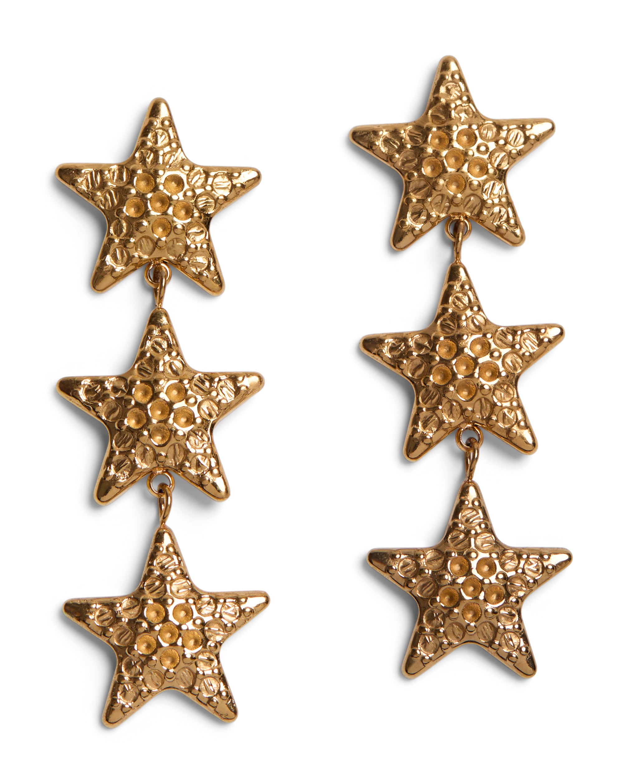 A vertical drop earring composed of three textured gold stars, designed to move softly with the wearer. Each star is subtly hammered, catching the light in an understated way rather than high shine.