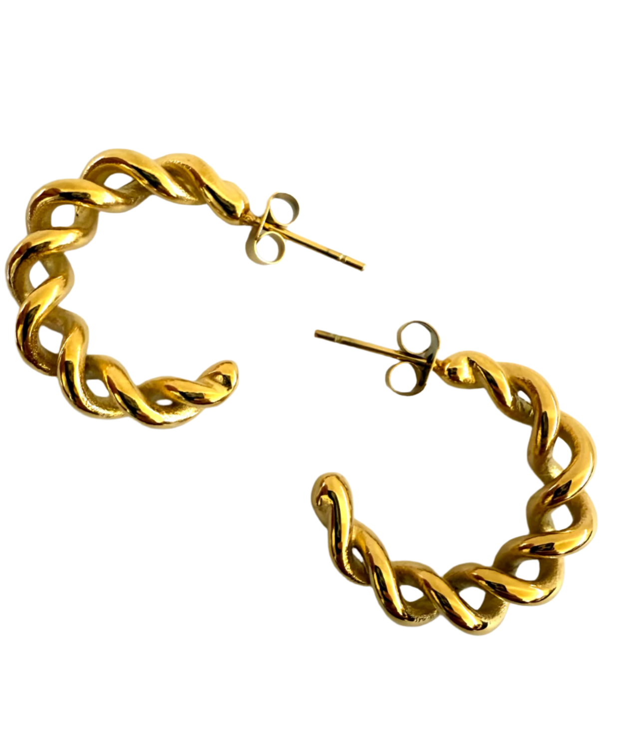 These twisted hoop earrings explore movement through form. Interlocking curves create a soft, continuous spiral—bold in shape, but refined in execution. Finished in polished gold, the surface catches light subtly rather than loudly, giving the hoops a sense of depth and fluidity.