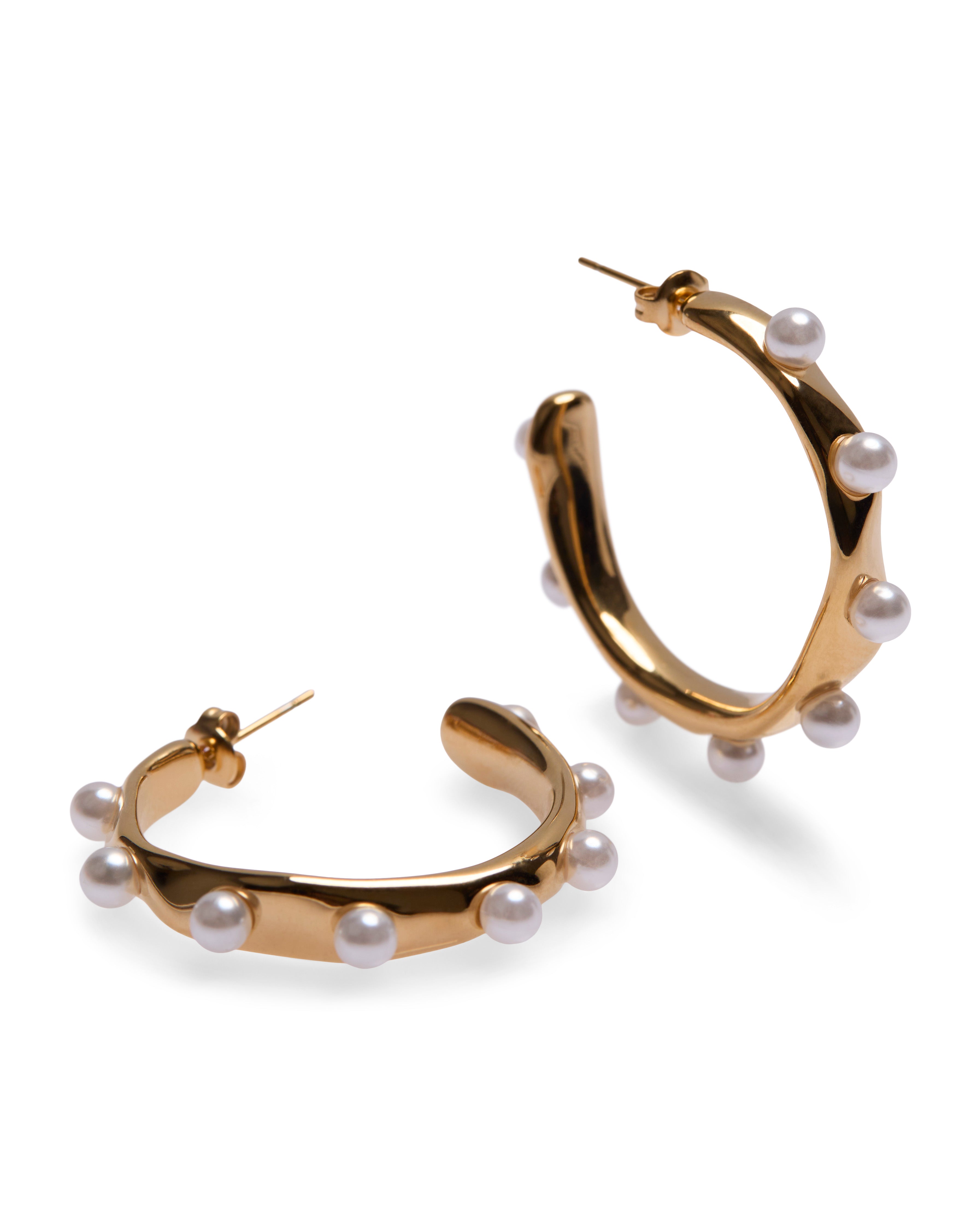 Smooth, polished hoops in gold or silver provide a structured foundation, while the pearls introduce subtle texture and light. The contrast is intentional—modern yet timeless, refined without feeling precious.