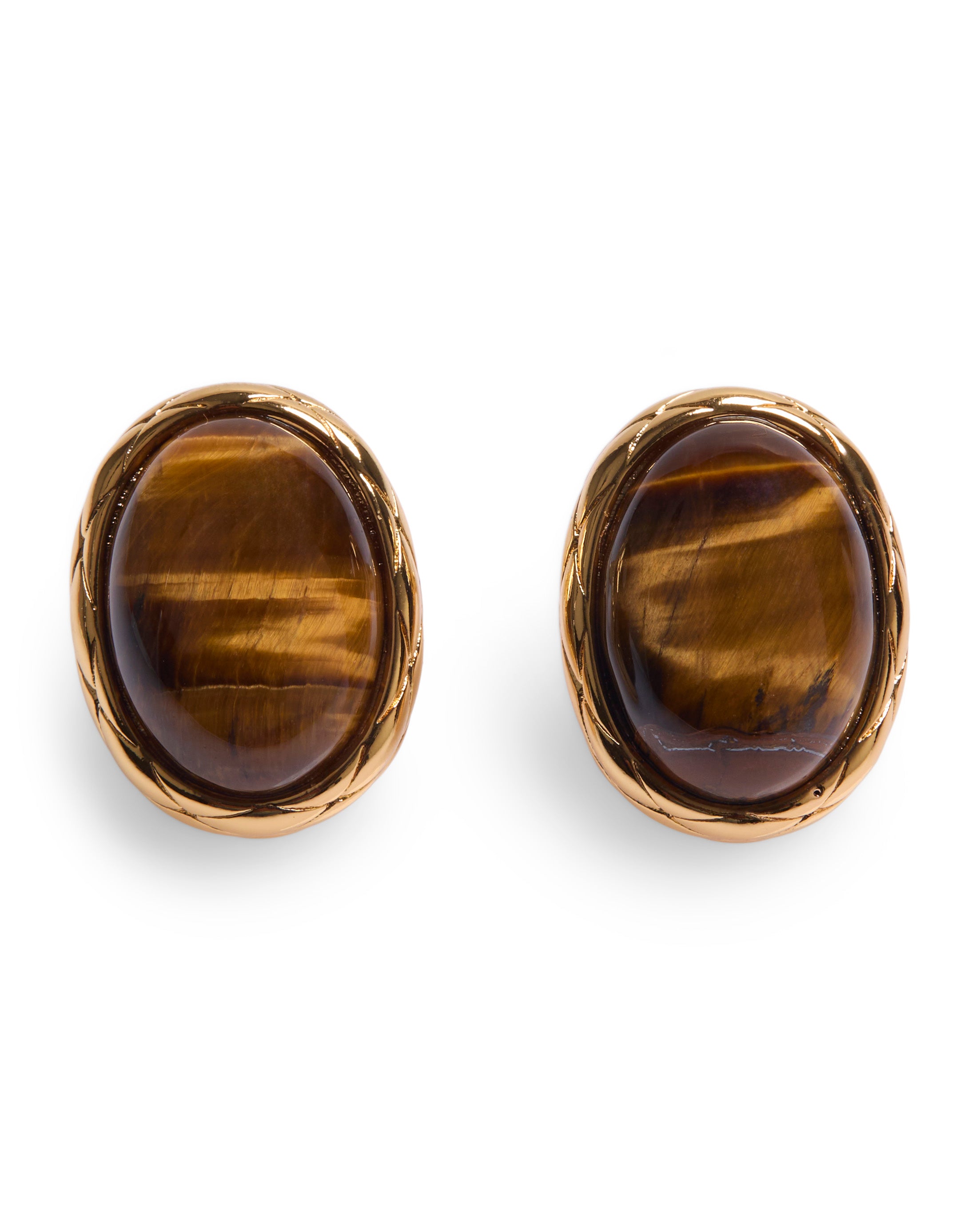 Shaped around naturally rich gemstones, these oval stud earrings highlight the depth and variation of lapis lazuli and tiger’s eye. Each stone is set within a softly twisted gold-tone bezel, adding subtle texture while keeping the silhouette clean and considered.