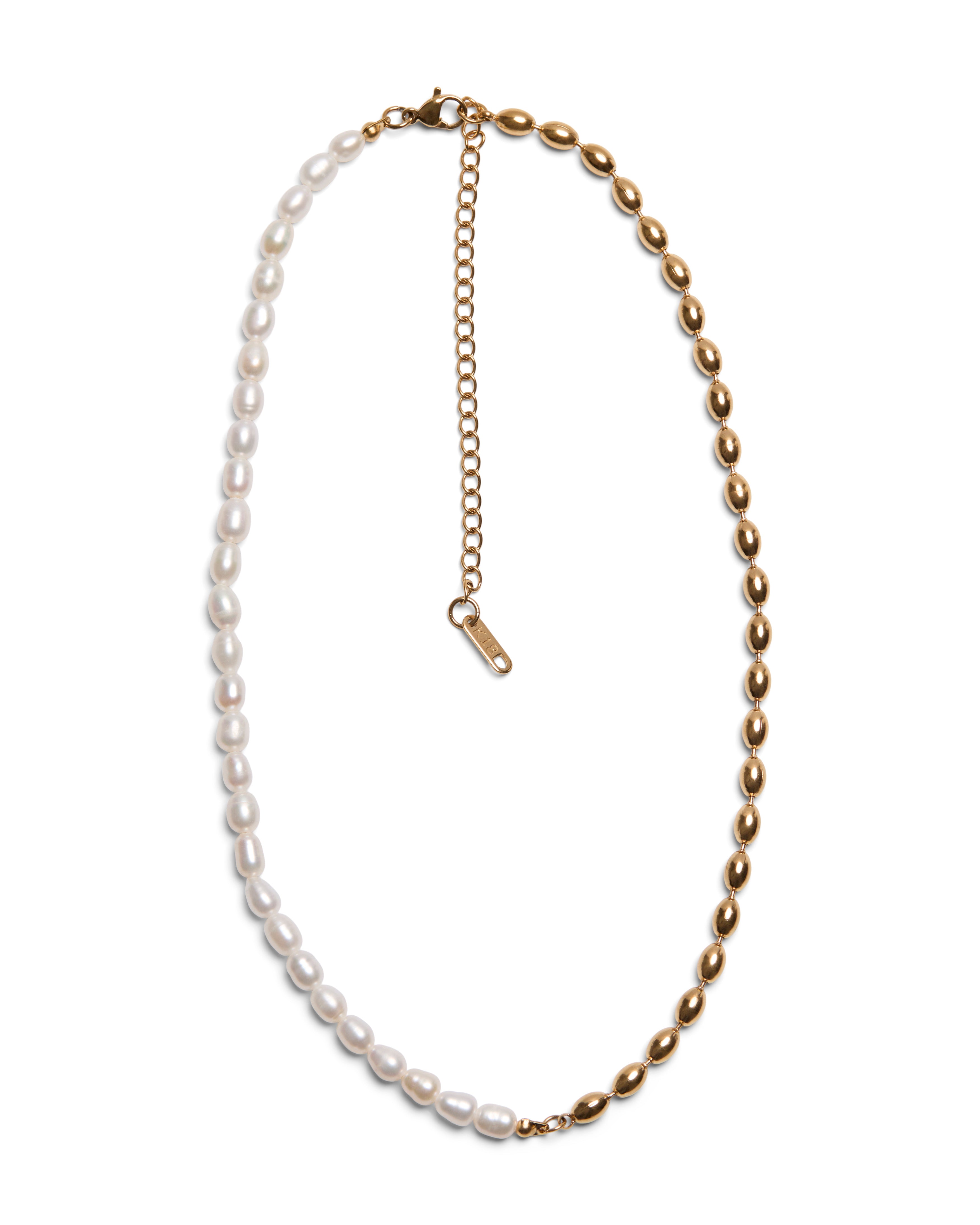 This necklace explores contrast through balance rather than excess. Soft freshwater pearls are paired with polished gold beads, creating a rhythm that feels both classic and distinctly modern. The alternating finish brings structure to an otherwise organic form — refined, but never rigid.